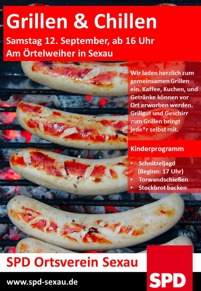 Der SPD Ortsverein Sexau lädt Sie herzlich zum gemeinsamen Grillen ein. Kaffee, Kuchen und Getränke können vor Ort erworben werden. Grillgut und Geschirr zum Grillen bringt einfach jede*r selbst mit.