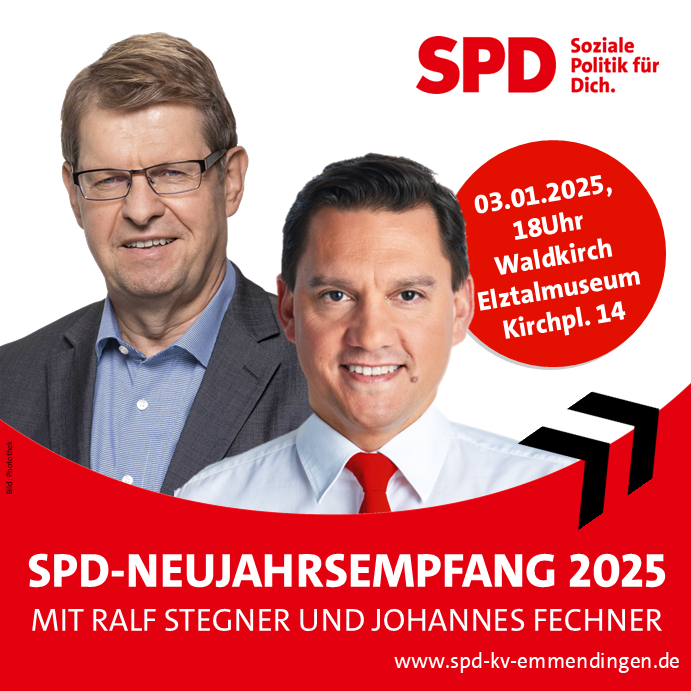 ganz herzlich laden wir Euch ein zum Neujahrsempfang unseres SPD-Kreisverbands. Wir konnten mit Ralf Stegner einen spannenden Redner gewinnen und freuen uns auf Euer zahlreiches Erscheinen am Freitag, den 3. Januar 2025 um 18.00 Uhr im Gewölbekeller des Elztalmuseums am Kirchplatz 14 in Waldkirch !