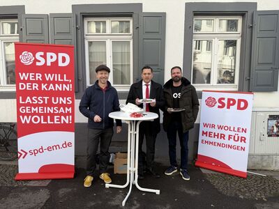 Am Samstag, den 06.12.2025, mischten sich die Vorsitzenden der SPD-Ortsvereine Emmendingen und Mundingen, Frieder Haid und Gabriel Witt, unter die Bürgerinnen und Bürger der Stadt und repräsentierten die lokalen Vertretungen der SPD am Schneckenbrunnen. Unterstützt wurden sie dabei von unserem Bundestagsabgeordneten und Kreisvorsitzenden Johannes Fechner.